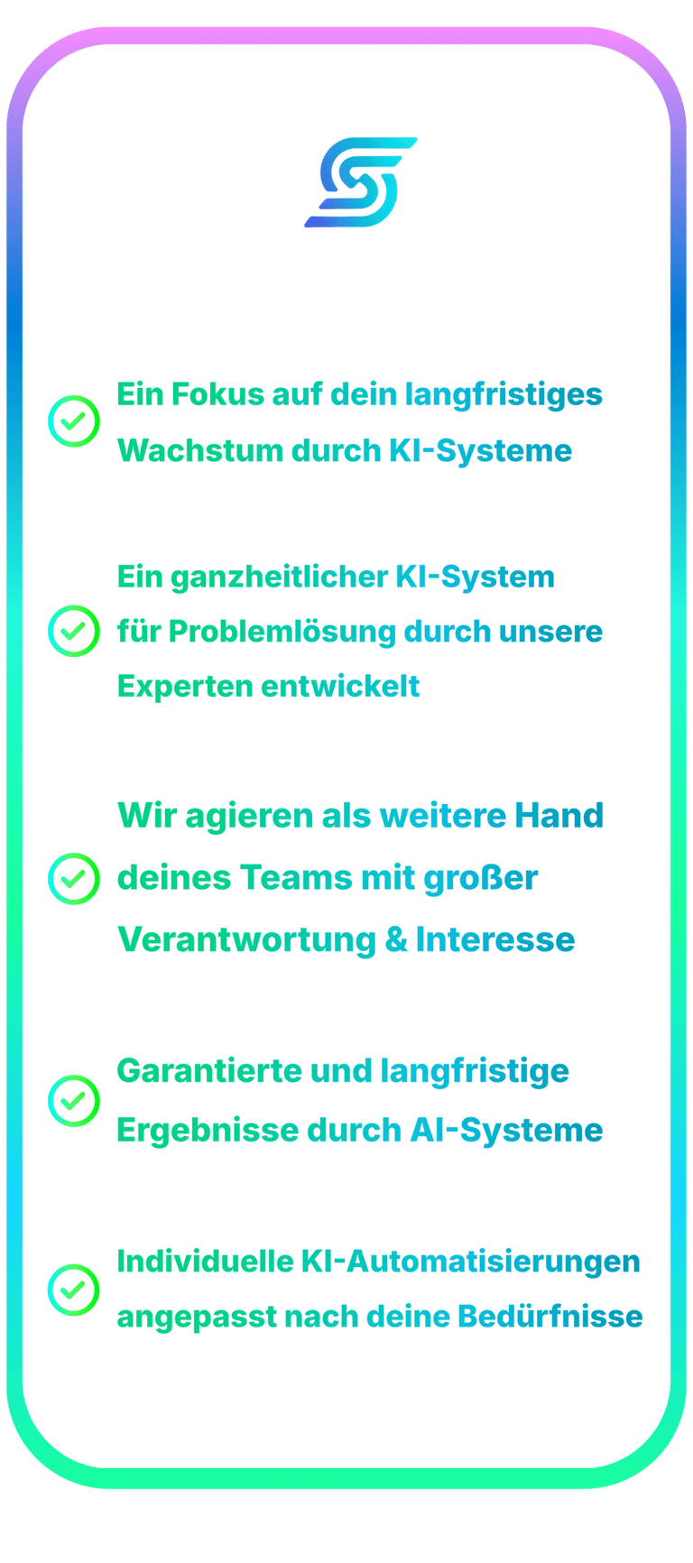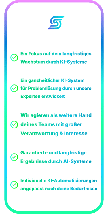 Wir garantieren, dass unsere künstliche Intelligenz ein echter Gamechanger für Unternehmen jeder Größe ist. Wir analysieren deine Prozesse, erkennen Potenziale und schaffen individuelle AI-Tools, dein Arbeitsalltag im Business vereinfachen, mit dem Hauptaugenmerk, Abläufe zu automatisieren und Wachstum zu beschleunigen.